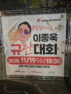 창원특례시 진해구 석동 사거리에서 지난 11월 19일 18:30분 더불어민주당 진해 지역위원회‧진보당‧정의당 등 시민단체 30여 명이 참석한 가운데 '경남경찰청은 불법 정치자금 의혹, 이종욱 의원 신속히 수사하라'며 집회를 개최했다.경남경찰청 관계자는 "선거캠프에 관계자 및 선거자금 전달자에 관여한 주변 인물 참고인 등에 대해 조사를 이미 마무리했으며 불법정치자금법 수수 의혹으로 이종욱 의원에게 1, 2차 소환 출석요구를 하였으나 국정감사 일정 등으로 소환에 불응했고 3차 소환을 통보한 상황이다."라며 "3차 소환까지 불응하면 강제