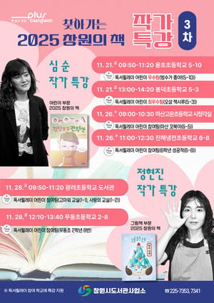 창원특례시 도서관사업소(소장 이승룡)는 21일부터 28일까지 ‘찾아가는 2025 창원의 책 작가 특강’을 운영한다.도서관사업소에서는 매년 창원의 책 함께 읽기 사업의 일환으로 창원의 책 독서릴레이를 운영하고 있다.독서릴레이는 한 권의 책을 팀원들이 함께 읽고 여러 독후활동을 통해 깊이 있게 감상하는 활동으로 올해 139팀 1,679명이 참여했다.이 중 우수팀 15팀을 선정해 시상했고, 우수팀 소속 학교에는 작가 특강을 지원한다.올해는 독서릴레이 어린이팀 소속 6개교 학생들이 ‘2025 창원의 책’ 작가들과 만날 예정이다.11월 21