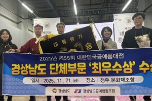 경상남도(도지사 박완수)는 21일 청주시 문화제조창에서 열린 ‘제55회 대한민국 공예품대전 시상식’에서 3년 연속 단체 최우수상(국가유산청장상)을 수상하고 대통령기를 수여받았다고 밝혔다.경남도는 지역 예선 성격으로 지난 7월 개최한 ‘경상남도 공예품대전’ 상위 수상작 42점을 ‘대한민국 공예품대전’에 출품해 입상자 수와 개인상 등급 점수 등에서 전국 최다 성과를 거두며 단체상 최우수상을 3년 연속 품에 안았다.1971년 시작된 ‘대한민국 공예품대전’은 국가유산청과 한국공예협동조합연합회가 주관하는 국내 최고 권위의 공예 경연대회로 평
