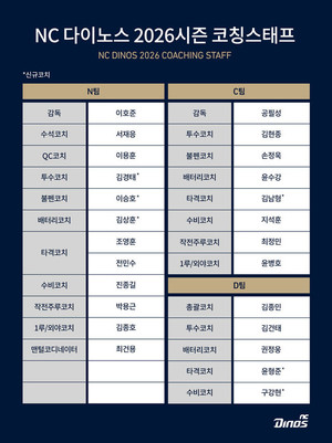 NC 다이노스는 18일 3명의 신규 코치를 선임하며 2026시즌 코칭스태프 구성을 마무리했다.김남형(전 한화) 타격코치, 구강현(전 두산) 수비코치가 새롭게 합류했으며 구단 자체 연수코치로 활동하던 윤형준 코치는 연수 프로그램을 마친 뒤 정식 코치로 선임됐다.김남형 C팀 타격코치는 한화에서 타격·수비·주루 등 다양한 분야를 담당하며 선수들의 다방면 성장을 이끌었으며 구강현 D팀 수비코치는 두산에서 수비코치와 재활코치로 활동하며 젊은 선수들의 기량 향상에 기여했다.윤형준 코치는 연수 기간 중 좋은 소통 능력과 지도력을 인정받아 D팀