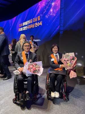 경상남도장애인체육회(회장 박완수) 탁구팀 주영대, 강외정 선수는 지난 11월 21일 서울 웨스틴조선호텔에서 열린 ‘2025년 체육발전유공 포상 및 제63회 대한민국체육상 전수식’에서 체육계 최고의 영예인 체육훈장 청룡장을 받았다.주영대 선수와 강외정 선수는 2007년부터 장애인탁구에 입문하여 현재까지 경상남도 장애인탁구의 주축으로 활동하고 있으며 다년간 국내외대회 출전 및 국가대표를 역임하는 등 국위 선양에 큰 역할을 했다.특히 주영대 선수는 2016 리우데 자네이루 패럴림픽 은메달, 2020 도쿄 패럴림픽 금메달, 2022 항저우