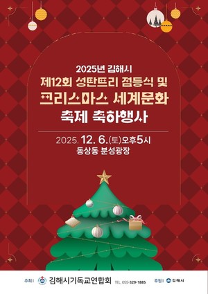 제12회 세계크리스마스 문화축제가 오는 12월 6일부터 27일까지 김해시민의 종과 분성광장 일원에서 개최된다.김해시기독교연합회에서 주최・주관하고 경남도와 김해시가 후원하는 이번 축제는 대형트리와 테마존 설치, 세계음식 체험, 공연 등 다문화도시 김해의 특색을 살린 다양한 프로그램으로 꾸며진다.이 기간 김해시민의 종 일원에 대형트리가 설치돼 연말 도심을 밝히며 분성광장에는 나라별로 꾸며진 트리와 다채로운 조명 장식이 따뜻한 겨울 분위기를 연출한다.축제 첫날 분성광장에서 캄보디아, 네팔 등 8개국의 크리스마스 의상 행진을 시작으로 점등