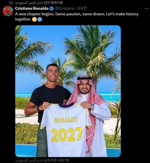 알나스르 구단은 26일(현지 시간) "호날두와 계약을 2년 연장하는 데 합의했다"고 밝혔다.이로써 이달 말 계약이 만료될 예정이었던 호날두는 2027년까지 알나스르 유니폼을 입게 됐다.2023년 1월 맨체스터 유나이티드(잉글랜드) 계약을 해지하고 알나스르에 합류한 호날두는 당시 2억 유로(약 3170억원) 상당의 연봉을 받는 것으로 알려졌다.이번 재계약도 비슷한 수준의 연봉을 받는 것으로 추정된다.호날두는 알나스르에서 두 시즌 반 동안 111경기에 출전해 99골을 터트렸다.2024~2025시즌엔 공식전 41경기에 출전해 35골을 넣