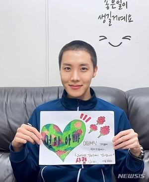 글로벌 슈퍼 그룹 '방탄소년단'(BTS) 멤버 제이홉(정호석)의 근황이 공개됐다. 지난 7일 국군 소통 서비스 '더 캠프' 앱에 게재된 어버이날을 맞아 부모님께 전할 편지를 들고 있는 훈련병들의 사진에서 제이홉의 모습이 포착됐다. 제이홉은 편안한 생활복에 짧은 삭발을 한 모습이다. 그는 그림에 '어버이날을 기념해 인사드립니다, 낳아주시고 길러주셔서 감사합니다! 사랑합니다'라는 문구를 적었다. 제이홉은 지난달 18일 강원도 원주시에 위치한 육군 36사단 신병교육대로 입소했다. 5주간의 기초군사훈련을 받은 뒤 자대배치를 받을 예정이다.
