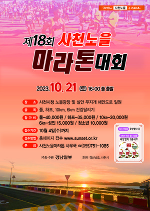 전국 9대 노을을 배경으로 아름다운 바닷길을 질주하는 제18회 사천노을마라톤대회가 오는 10월 21일 무지개 해안도로 일원에서 열린다. 경상남도·사천시(시장 박동식)가 후원하는 올해 대회는 지난 2019년을 마지막으로 코로나19 유행에 따라 이후 3년간 비대면으로 개최했던 과거를 딛고 4년 만에 정상 개최된 점이 특징이다. 특히, 폭염에 따른 안전사고를 예방하기 위해 대회 시기를 기존 8월에서 10월로 늦추면서 가을 석양의 아름다움을 만끽할 것으로 기대된다. 그리고, 원활한 행사 진행을 위해 출발점을 기존 사천 초전공원에서 사천시청