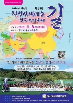 양산시(시장 나동연)는 11월 8일 오전 9시 웅상체육공원에서 "제3회 천성산생태숲길 전국걷기축제"가 개최된다고 밝혔다.이번 행사는 (사)양산도시문화연구원이 주최·주관하고, 양산시와 (사)한국걷는길연합이 후원한다.‘유라시아의 첫길, 천성산에서 유라시아로 가다’를 주제로 열리는 이번 축제는 천성산의 아름다운 숲길을 걸으며 생태와 문화, 평화의 가치를 공유하는 전국 규모의 걷기 행사다.특히 ‘천 가지 이야기를 품은 천성산’이라는 부제를 통해 천성산의 생태적 가치와 역사문화 자원을 널리 알리고 지역민의 자긍심을 고취하는 데 의미를 두고
