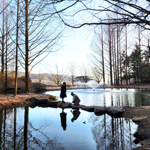 새싹이 움트는 봄을 맞은 낙강물길공원에 나들이객들이 북적인다. 우뚝 선 메타세콰이어 나무를 배경으로 연못에 가로놓인 징검다리는 요즘 가장 인기 있는 포토스팟이다.