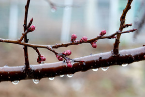 지난해 12월부터 극심한 가뭄을 겪은 창녕군에 지난 17일부터 봄을 재촉하는 단비가 내려 복숭아 꽃망울에 물방울이 맺혀 있다. 이날 창녕의 평균 강우량은 12.9mm를 기록했다.
