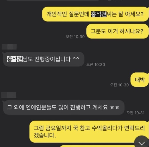 공개된 사진에는 홍석천의 이름을 악용해 코인 투자를 유도하는 내용의 메신저 대화가 담겼다. 사기꾼은 "홍석천 님도 진행 중이십니다. 그 외에 연예인 분들도 많이 진행하고 계세요."라고 했다.