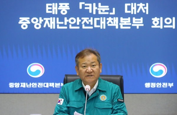 이상민 중앙재난안전대책본부장 겸 행정안전부 장관은 10일 하루 제6호 태풍 '카눈'의 영향권에 들 것으로 전망된다며 외출을 자제하고 실내에 머물러줄 것을 거듭 당부했다.