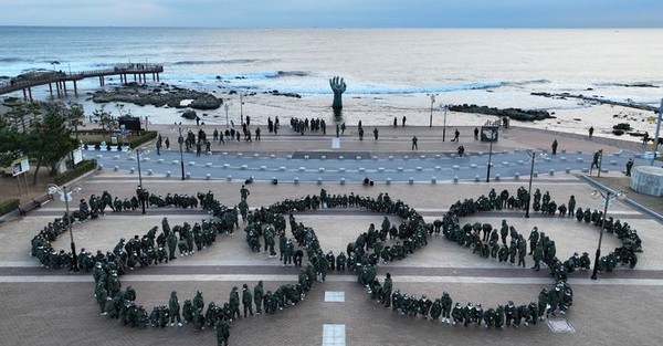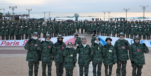 이기홍 대한체육회장, 장체근 선수촌장, 우상혁(높이뛰기) 등 400여 명은 결단식에서 호미곶 해맞이광장에 오륜마크를 만들며 의지를 다졌다.
