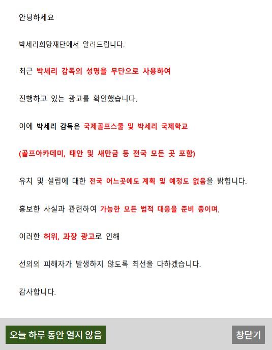박세리희망재단은 홈페이지에 '박세리 감독은 국제골프스쿨, 박세리 국제학교(골프 아카데미 및 태안, 새만금 등 전국 모든 곳 포함) 유치 및 설립 계획·예정이 없다'는 안내문을 내걸었다.