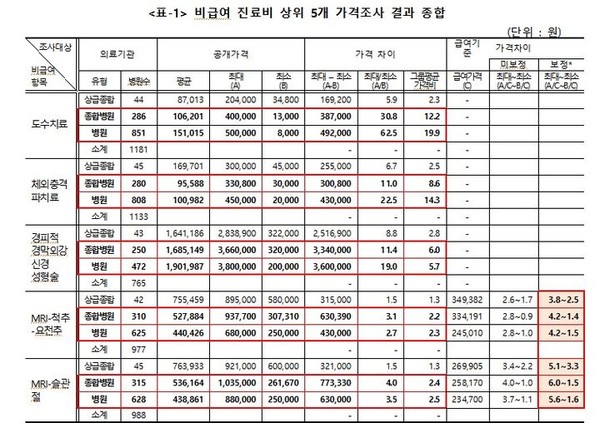 나머지 3개 항목도 기관별 차이가 컸다. 체외충격파치료의 경우 병원급에서 기관별로 최대 43만원(22.5배) 차이가 났다. MRI-척추-요천추는 종합병원에서 가격 격차가 최대 63만원(3.1배), MRI-슬관절은 종합병원에서 최대 77만3000원 가량(4배) 차이가 나는 것으로 분석됐다.