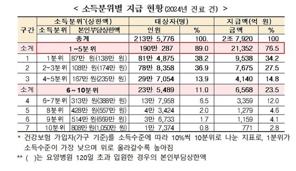 작년 기준 환급대상자의 소득분위를 보면 소득하위 50% 이하 대상자와 지급액이 각각 190만287명, 2조1352억원이다. 이는 전체 대상자의 89%, 지급액의 76.5%를 차지하는 것으로 소득 하위계층의 의료비 부담을 덜어주는 효과가 있다는 평가다.