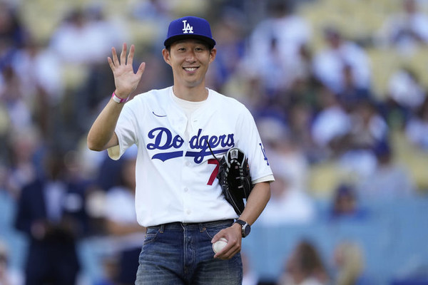 마운드에 등장한 손흥민은 본인을 상징하는 등번호 '7번', 'SON'이 새겨진 유니폼과 LA 다저스 모자를 착용한 모습이었다.