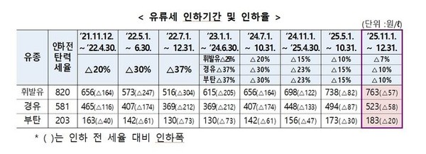 유류세 한시적 인하조치 연장에 관한 '교통·에너지·환경세법 시행령', '개별소비세법 시행령' 개정안은 입법예고(10월 23일~24일), 관계부처 협의 및 국무회의 등을 거쳐 11월 1일부터 시행될 예정이다.