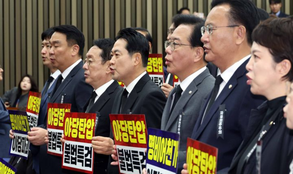국민의힘 의원들은 로텐더홀에서 검은 마스크를 끼고 침묵 시위를 벌였다. '야당탄압', '불법특검' 등이 적힌 손팻말도 들었다.