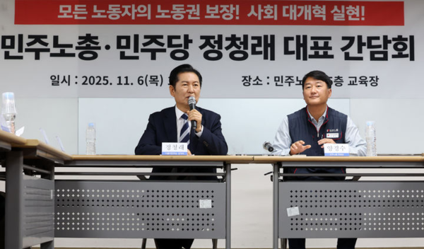 정청래 더불어민주당 대표는 6일 오전 서울 중구 전국민주노동조합총연맹에서 열린 '민주노총-민주당 정책간담회'에서 "윤석열 정권 3년 동안 우리 노동계는 정말 어려움이 더 많았고, 또 거듭되는 산업 재해 속에서 노동자들의 생명과 안전을 최우선적으로 지켜달라는 외침이 정말 많았는데 항상 외면당했던 것 같다"고 말하며 "생존권을 지키기 위해 거리로 뛰쳐나온 노동자들을 강성 노조니, 귀족 노조니 매도하기도 했다"고 했다.
