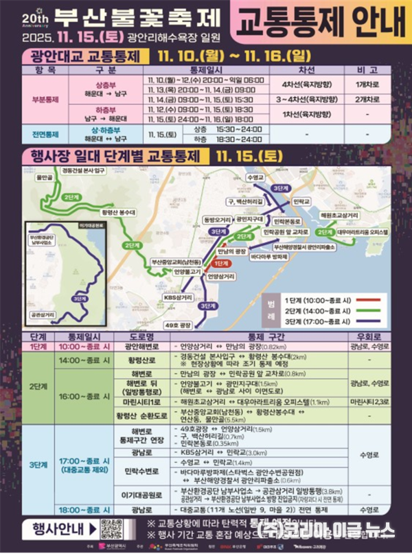 이와 함께, 시는 원활한 행사 진행을 위해 오늘(10일)부터 11월 15일까지 광안대교 등의 교통을 통제한다.