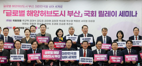 송언석 국민의힘 원내대표는 19일 오후 국회에서 국민의힘 부산광역시당 주관으로 열린 '글로벌 해양허브도시 부산 국회 릴레이 세미나 : 글로벌 해양허브도시 부산, 대한민국을 넘어 세계로'에 참석해 "부산이 대한민국을 대표해서 글로벌 해양허브 도시로서 거듭날 수 있도록 정책적으로, 제도적으로 시스템을 만들 수 있도록 힘을 합쳤으면 좋겠다"라고 전했다.